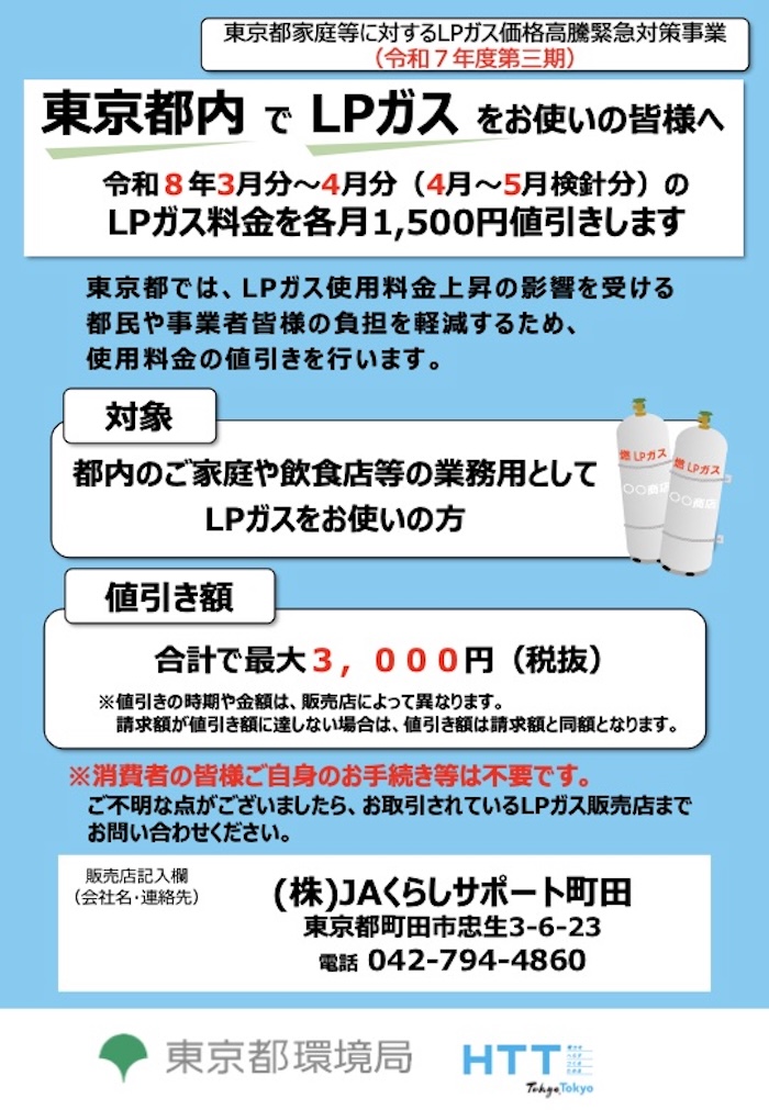 JA町田市は、全額出資子会社「株式会社JAくらしサポート町田」を設立し、LPガス業務を継承しました。ご利用料金や代金決済・ボンベ配送・設備機器類など今まで通りですが、保安業務の実施先が下記に変更になっていますのでご確認ください。